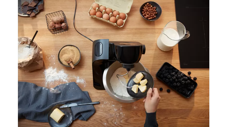 מגוון רחב של אביזרים: סט אביזרי קונדיטוריה מקצועיים, מעבד מזון עם דסקיות שונות ותיק לאחסון האביזרים