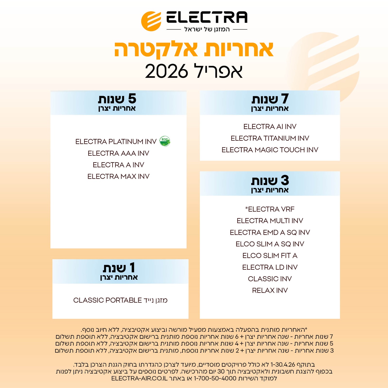 תנאים ואחריות למוצרי ELECTRA מבית אלקטרה